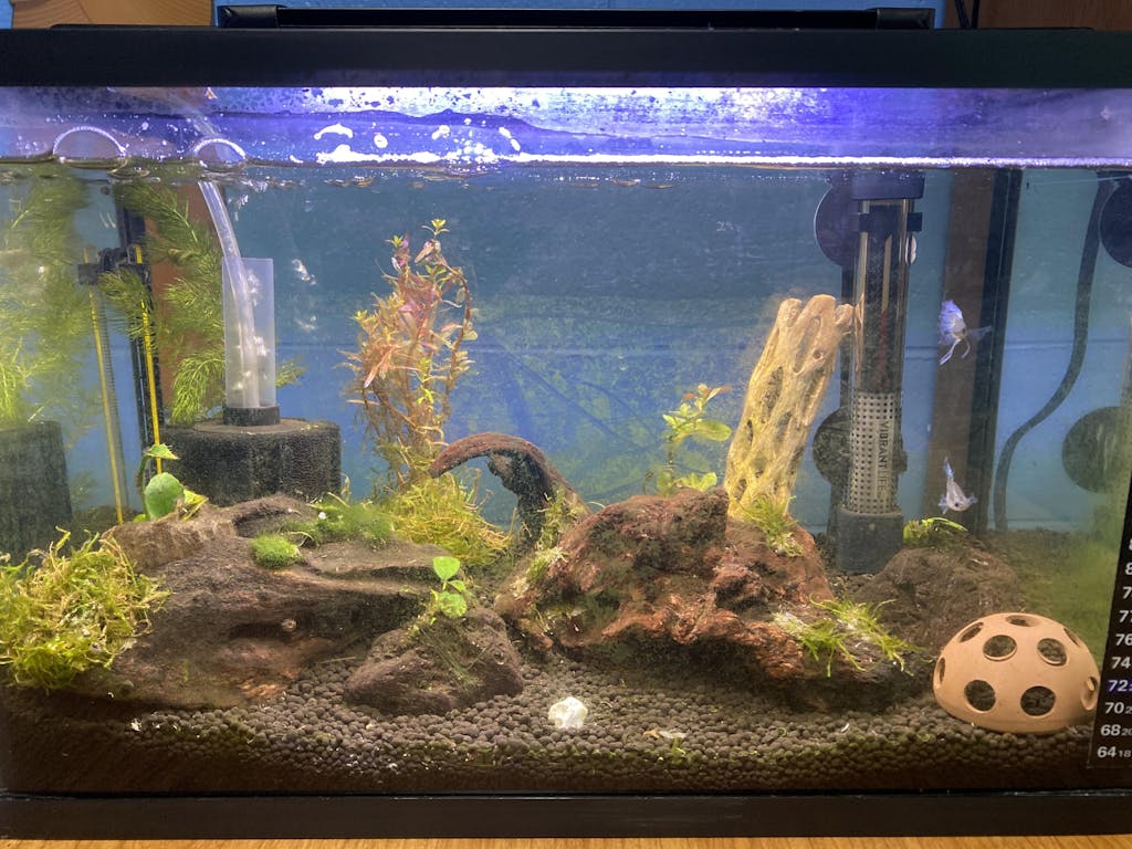'Orange Juice' planted directly behind a group of deep-green Anubias barteri or a piece of driftwood planted with dark-toned Bucephalandra is one of the simplest and most effective color contrast arrangements in the low-tech planted hobby — the warm amber-orange of the Rotala against the cool, deep green of the Anubias or Buce creates an immediate, natural-looking warm-cool contrast that requires no CO₂, no aquascaping skill, and no expensive equipment to achieve.